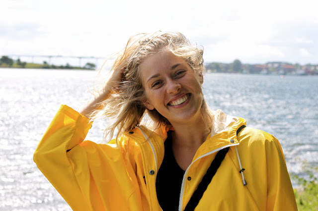 Jeg har fået mig en ny gul sag. Med denne regnjakke på, føler jeg, at jeg kan klare alt! Den nye danske, gule superhelt. Min mutter og jeg gik en tur nede ved vandet i et sådant vejr, som har præget lille Danmark en lang periode nu. Sol, regn, sol, regn, sol regn. Og blæst! På søndag flygter jeg afsted fra vejret og ned til 40 graders varme i Grækenland med tre søde piger. Jeg må hellere lade min smarte, gule regnjakke blive hjemme denne gang. Desværre..